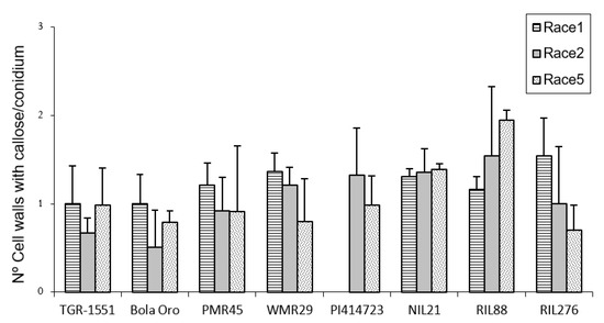 Regarding callose accumulation in cells walls, significant differences were found among races and also among lines for the same race tested (Figure 3). Significant differences among powdery mildew races 1, 2, and 5 were observed in “Bola de Oro” (1, 0.44, 0.78), “PI 414723” (1.3 and 1 for races 2 and 5, respectively; race 1 was not tested), “WMR 29” (1.3, 1.2, 0.8) (lowest value for race 5), RIL88 (0.96, 1.5, 1.94) and RIL276 (1.5, 1, 0.7). No differences were noticed for “TGR-1551” (1, 0.7, 1), NIL21 (around 1.3 for the three races) and “PMR 45” (0.7, 0.91, 0.92) (Figure 3). The lack of differences detected in “PMR 45” (resistant to race 1, susceptible to races 2 and 5) could be due to the non-presence or short development of the fungus in many of the conidia observed for race 1 (value of 0.7, incompatible interaction). Moreover, no differences were noticed between “Bola de Oro” and “TGR-1551” for each of the three races tested. In general, highest values (value above 1) were detected in most of the described incompatible interactions, although observations at later time points post inoculation could be needed to discern properly between compatible and incompatible interactions.