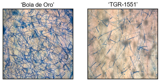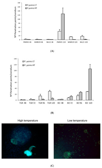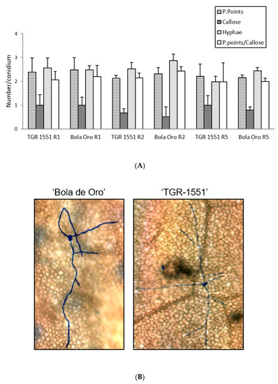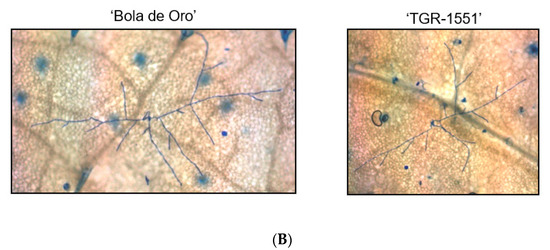 In summary, differences between “TGR-1551” and “Bola de Oro” could be observed at high temperatures at all-time points tested for the number of penetration points with callose (Figure 8B,C), number of cells with callose and primary hyphae, and for conidiophores counted at 120 hpi (data not shown), due to the no growth of most of the conidia on “TGR-1551” at that temperature. Nevertheless, at low temperatures, as described before, differences among these lines started to be noticed at 72 hpi for the number of cells with callose and above 120 hpi for the number of conidiophores.