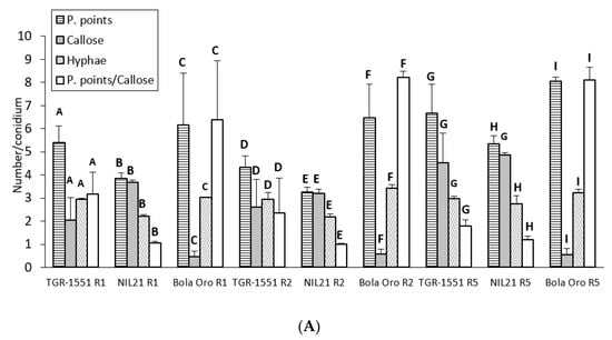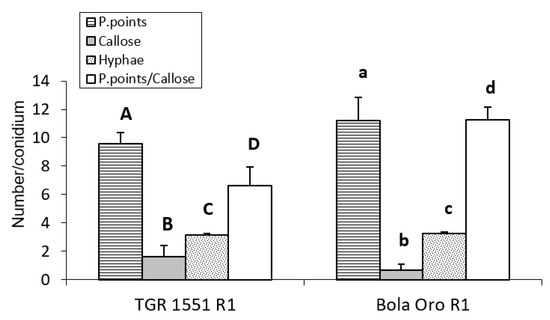 For the observations at 96 hpi, three plants per genotype (“TGR-1551” and “Bola de Oro”) were inoculated only with race 1 (Figure 6), since no large differences were observed previously among races for these parameters. In this case, significant differences were detected between “TGR-1551” and “Bola de Oro” for all the variables tested, except for the number of primary hyphae. The highest differences were found for the number of cells with callose and in the ratio P. points/callose (Figure 6). We observed around 50% more cells with callose accumulation in their cell walls in “TGR-1551” than in “Bola de Oro”; in addition, the number of P. points was quite similar, a 15% more in “Bola de Oro” than in “TGR-1551”.