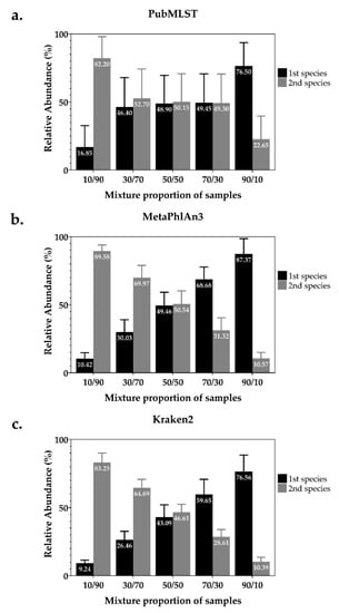 Average relative abundance (%) of each NTM species presented in simulated mixed samples were estimated by (a) PubMLST, (b) MetaPhlAn3 and (c) Kraken2. (a) One sample was identified as a single species. (b) One simulated mixed NTM species sample levels and five samples were excluded.