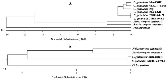 The morphology of the C. guttulatus Zhejiang strain was observed under a light microscope at 400× magnification. Molecular identification was performed by PCR and gene sequencing. Two specific primer pairs for the small subunit (18S) and large subunit (26S) ribosomal RNA genes were synthesised according to Kurtzman C.P. (1998) [29]. The primer pairs were as follows: 18S upper primer (TACGGTGAAACTGCGAATGG), 18S lower primer (GCTGATGACTTGCGCTTACT), 26S upper primer (GCATATCAATAAGCGGAGGAAAAG) and 26S lower primer (GGTCCGTGTTTCAAGACGG). The PCR conditions for the 18S DNA fragment were an initial denaturation at 95 °C for 5 min, followed by 30 cycles of 94 °C denaturation for 45 s, primer annealing at 55 °C for 45 s, and extension at 72 °C for 90 s. A final primer extension of 10 min at 72 °C completed the amplification process. The amplification for 26S was the same as that for 18S, although the extension at 72 °C was extended to 120 s during the PCR cycles. C. guttulatus vegetative cells were directly used as the template for PCR. The PCR products were examined and separated by 1% agarose gel electrophoresis. The target bands were purified by a gel extraction kit and sequenced by Sangon Biotech (Shanghai, China). The sequenced 18S and 26S gene fragments of the C. guttulatus Zhejiang isolates were submitted to GenBank with the Bankit procedure and blasted in the NCBI (National Center for Biotechnology Information, Bethesda, MD, USA) database. Similar reference sequences were retrieved. Phylogenetic analysis was performed using the MegAlign program (DNAstar Inc., Madison, WI, USA). The phylogenetic tree was constructed using the Clustal W method. Information about C. guttulatus isolates and other yeast species used in the construction of the phylogenetic trees is listed in Table 1.