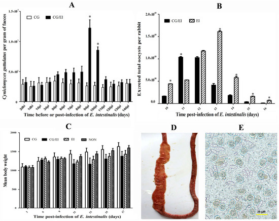 Effects of co-inoculation of SPF rabbits with C. guttulatus and E. intestinalis. (A) Faecal excretion of C. guttulatus in rabbits inoculated with C. guttulatus only (CG) or inoculated with C. guttulatus and E. intestinalis (CG/EI). dbi/dpi= days before the infection of E. intestinalis/days after the infection of E. intestinalis. (B) Faecal oocyst counts in rabbits 10 to 16 days after infection with E. intestinalis without preinoculation with C. guttulatus (EI) or inoculation with both C. guttulatus and E. intestinalis (CG/EI). (C) Body weight of rabbits inoculated with C. guttulatus only (CG), co-inoculated with C. guttulatus and E. intestinalis (CG/EI), or with E. intestinalis only (EI), and control rabbits (NON) (D,E) Gross lesions of the small intestine and C. guttulatus vegetative cells and E. intestinalis oocysts in faeces of the dead rabbit co-inoculated with C. guttulatus and E. intestinalis. “*” indicated significant difference of datas between CG/EI and CG or EI groups (p ≤ 0.05).