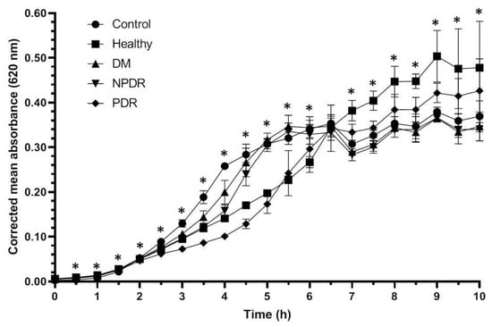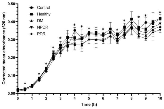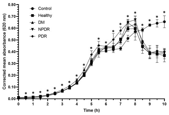 Antibacterial activity of tears against Staphylococcus aureus ATCC 29213 strain. The y-axis represents the corrected mean absorbance values (±SD) of three technical replicates while the x-axis shows the time of the experiment in hours. * Indicates significant differences between the groups (p < 0.05). The differences between the individual groups are detailed in Table 1.