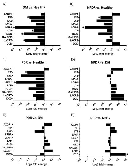 Quantitative analysis of tear proteins by selected reaction monitoring. The log2 fold change of the studied proteins in tears are indicated. (A) Tear samples from patients with diabetes without retinopathy (DM) compared to healthy controls. (B) Tear samples from patients with non-proliferative diabetic retinopathy (NPDR) compared to the healthy controls. (C) Tear samples from patients with proliferative diabetic retinopathy (PDR) compared to the healthy controls. (D) Tear samples from NPDR groups compared to the DM group. (E) Tear samples from PDR groups compared to the DM group. (F) Tear samples from PDR groups compared to the NPDR group. * p < 0.05. The proteins are labeled using their gene names; AZGP1: Znα2 glycoprotein, PIP: prolactin-inducible protein, LYZ: lysozyme-C, LPNA: lipophilin A, LCN1: lipocalin-1, LTF: lactotransferrin, IGLC: Ig λ chain C region, LACRT: extracellular glycoprotein lacritin, GAL3BP: galectin 3-binding protein, DCD: dermcidin.
