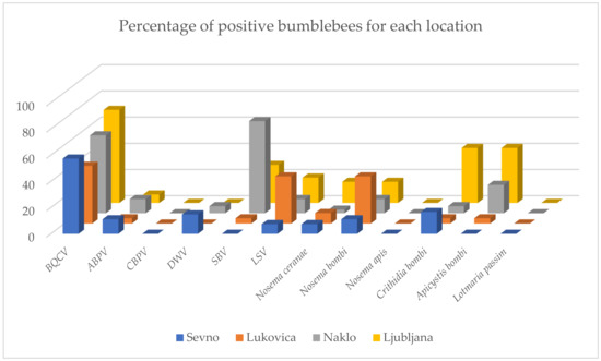 Comparison of positive bumblebee samples at four locations (Sevno, Lukovica, Naklo and Ljubljana). Results are presented together as a percentage of positive samples for samplings in 2017 and 2018 for all tested pathogens (BQCV = black queen cell virus, ABPV = acute bee paralysis virus, CBPV = chronic bee paralysis virus, DWV = deformed wing virus, SBV = sacbrood bee virus, LSV = Lake Sinai virus).