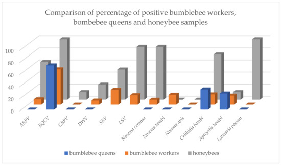 Comparison of percentage of positive bumblebee worker, bumblebee queen and honeybee samples. Results for both years of sampling and for all four locations are presented together for all tested pathogens (BQCV = black queen cell virus, ABPV = acute bee paralysis virus, CBPV = chronic bee paralysis virus, DWV = deformed wing virus, SBV = sacbrood bee virus, LSV = Lake Sinai virus).