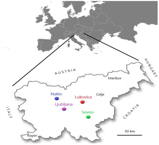 Four locations (Sevno, Lukovica, Naklo and Ljubljana) on the map of Slovenia where samples were collected in 2017 and 2018.