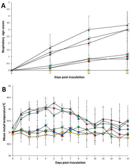 Respiratory sign scores (A) and rectal temperature (B) of pigs dually inoculated with PCV2a/PRRSV-2 (▲), PCV2b/PRRSV-2 (▲), and PCV2d/PRRSV-2 (▲), and pigs singularly inoculated with PCV2a (●), PCV2b (●), and PCV2d (●), and negative control pigs (●). Variation is expressed as the standard deviation. Different superscripts (a and b) indicate significant (p < 0.05) difference among 7 groups.