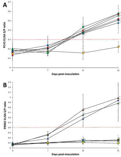 Porcine circovirus type 2 (PCV2)-specific ELISA antibody levels (A) and porcine reproductive and respiratory syndrome virus (PRRSV)-specific ELISA antibody levels (B) of pigs dually inoculated with PCV2a/PRRSV-2 (▲), PCV2b/PRRSV-2 (▲), and PCV2d/PRRSV-2 (▲), and pigs singularly inoculated with PCV2a (●), PCV2b (●), and PCV2d (●), and negative control pigs (●). Variation is expressed as the standard deviation. Different superscripts (a and b) indicate significant (p < 0.05) difference among 7 groups.