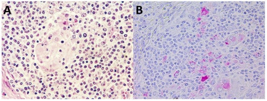 Immunohistochemistry (IHC) and morphometric analysis of IHC was carried out as previously described []. Positive signal was quantified using the NIH Image J 1.45s Program (http://imagej.nih.gov/ij/download.html, accessed on 12 July 2021). For each slide of lymph node tissue, 10 fields were randomly selected, and the number of positive cells per unit area (0.25 mm2) was counted. The mean values were also calculated [].