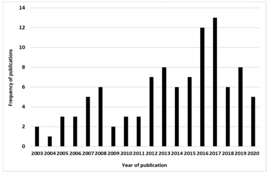 This systematic review highlights the increasing interest of scientists in the modeling of species environmental requirements and their geographic distribution (Figure 3 and Figure 4). It has also confirmed the continuous interest of governments, farmers and other stakeholders who provide funding for the development of such models. Ticks and TBD have both medical and economic importance, and this can be noticed through the huge economic losses caused to breeders and the various diseases that can transmit from animals to humans. A better understanding of these environmental requirements and geographic distribution can lead to better management of their control and/or eradication. Climate change as a driver also favors changes in the behavior of these parasites (ectoparasites and hemoparasites). Therefore, the various models help to know the adaptability of ticks to climate changes and forecast their distribution according to this adaptability to further changes.