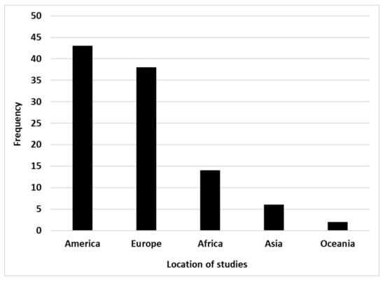 The number of publications that focused on modeling ticks and TBD increased over time, which could reflect increased scientific attention or interest (Figure 3). America (43%) and Europe (38%) are areas more concerned by this modeling but Africa (14%) has also an interest in this research subject (Figure 4). Asia and Oceania are the less concerned by TTBD modeling with, respectively, 6% and 2% of the selected publications. Considering our study period (2001–2020), the first modeling of ticks and TBD in Africa took place in the first half of our study period, i.e., in 2003. The most recent tick modeling study over our study period was done in 2019. Oceania appeared as a continent less concerned by TTBD modeling. At the country level, the United State of America (USA) was the area the more concerned with modeling ticks and their transmitted pathogens. Globally, the majority of the studies took place in developed countries.