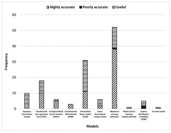 Most of the models that tested the predictive performance were classified as at least “useful” (AUC ≥ 0.7). Indeed, it is supposed that the models that are not useful are not published or the value of sensitivity is not clearly stated. The most commonly used model is the GLM but the best model according to the robustness analysis is the MaxEnt model. The MaxEnt model was classified on its robustness as (in a decreasing order) highly accurate (in 73.08% of cases), useful (in 25% of cases), and poorly accurate (in 1.92% of cases). While the GLM model was classified on its prediction accuracy as (in a decreasing order) useful (in 64.52% of cases) and highly accurate (in 35.48% of cases) (Figure 6). The papers that use the MaxEnt model stated the accuracy at 75.86% while those that use the GLM stated the accuracy at 37.5%.