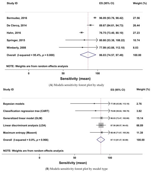 This meta-analysis was possible with 20 of the 100 worldwide selected articles. The meta-analysis with sensitivity data was done with five studies. The forest plot shows that the sensitivities have different effect sizes in the various studies (Figure 8a). All effect sizes (ES) were positive and significant because none of their confidence intervals include zero. The study with the highest weight in this meta-analysis is that of Bermudez [16]. The one with the lowest weight is the study of Wimberly [102]. This meta-analysis revealed a very high degree of heterogeneity in the sensitivities ES (heterogeneity chi-squared = 87.20 (d.f. = 4) p < 0.001; I-squared (variation in ES attributable to heterogeneity) = 95.4%; test of ES = 0, z = 14.71, p < 0.001). This information suggests that there are some subgroups of sensitivities (i.e., type of models) in these studies. A meta-analysis by type of models was needed to check it. The meta-analysis considering the type of models as subpopulations showed a homogeneity (heterogeneity chi-squared = 0.57 (d.f. = 4) p = 0.966; I-squared (variation in ES attributable to heterogeneity) = 0.0%; test of ES = 0, z = 30.13, p < 0.001) with the sensitivity data (Figure 8b). The funnel plot (Figure 8c) confirmed this homogeneity. This funnel plot showed a symmetrical shape that means an absence of publication bias in the studies. It also showed that among the five models studied in this meta-analysis there was one that was very precise with a small standard deviation and located at the top of the funnel on the graph. Three models are very close to the average, proof of their very good precision (Figure 8c). There are three models (MaxEnt, GLM and LDA) in which sensitivity effect sizes are greater than the pooled effect size of the meta-analysis (Figure 8b). The MaxEnt model has the highest sensitivity effect size (i.e., 88.46).