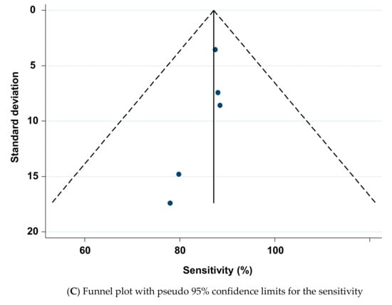 Forest plots (A,B) and funnel plot (C) of the sensitivity of models using meta-analysis. Forest plot legend: ES (effect size); CI (confidence interval); names on the left (first author of primary studies); solid line (sensitivity mean); grey square size (weight of each study); horizontal lines (95 confidence intervals); vertical line (line of no effect); diamond (overall sensitivity effect); vertical dash line (combined sensitivity effect); tips of diamond (95% confidence intervals).