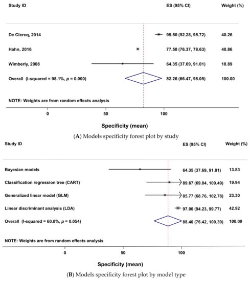 The meta-analysis of specificity data was done with three studies. The forest plot of this meta-analysis (Figure 9A) also showed a high heterogeneity (heterogeneity chi-squared = 108.05 (d.f. = 2), p < 0.001; I-squared (variation in ES attributable to heterogeneity) = 98.1%; test of ES = 0, z = 10.21, p < 0.001). The analysis done considering the type of model as subgroups and plotted on Figure 9B showed a moderate heterogeneity in the specificity effect size (heterogeneity chi-squared = 7.66 (d.f. = 3), p = 0.054; I-squared (variation in ES attributable to heterogeneity) = 0.0%, test of ES = 0, z = 14.46, p < 0.001). Among the four model groups, the linear discriminant analysis (LDA) and the CART models specificity effect size are greater than the pooled one (Figure 9B). The LDA had the greatest specificity effect size (i.e., 97) and the Bayesian models had the lowest specificity (i.e., 64.35).
