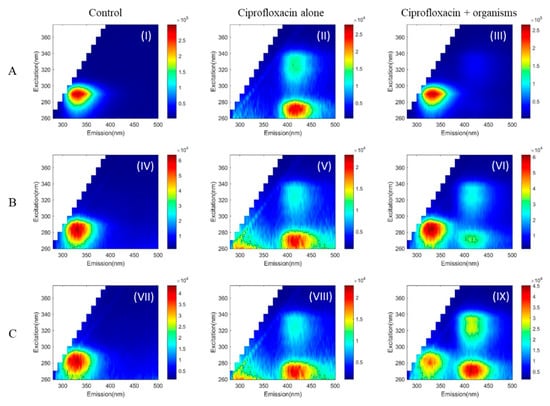Autofluorescence pattern of Acanthamoeba Castellanii (A, I–III), Pseudomonas aeruginosa (B, IV–VI), and Staphylococcus aureus (C, VII–IX). Control—organisms alone (I,IV,VII), ciprofloxacin alone (II,V,VIII), and organisms with ciprofloxacin (III,VI,IX). Full width half maximum (black dashed line) shows the shape of EEM/each peak calculated. Ciprofloxacin test concentration—0.00625 μg/mL.