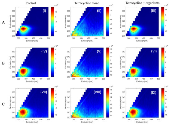 Autofluorescence pattern of Acanthamoeba Castellanii (A, I–III), Pseudomonas aeruginosa (B, IV–VI), and Staphylococcus aureus (C, VII–IX). Control—organisms alone (I,IV,VII), tetracycline alone (II,V,VIII), and organisms with tetracycline (III,VI,IX). Full width half maximum (black dashed line) shows the shape of EEM/each peak calculated. Tetracycline test concentration—0.0125 μg/mL.