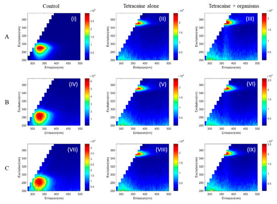 Autofluorescence pattern of Acanthamoeba Castellanii (A, I–III), Pseudomonas aeruginosa (B, IV–VI), and Staphylococcus aureus (C, VII–IX). Control—organisms alone (I,IV,VII), tetracaine alone (II,V,VIII), and organisms with tetracaine (III,VI,IX). Full width half maximum (black dashed line) shows the shape of EEM/each peak calculated. Tetracaine test concentration—10 µg/mL.