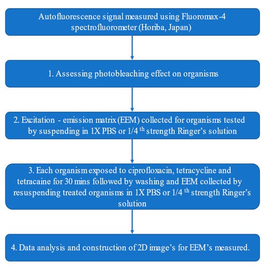 Autofluorescence signals were measured using an excitation–emission matrix in a Fluoromax-4 spectrofluorometer (Horiba, Tokyo, Japan) and the flow of the experiments is given in Figure 4. Firstly, any photobleaching caused by light exposure of the cells was assessed by measuring emission spectra of Acanthamoeba castellanii, Pseudomonas aeruginosa, and Staphylococcus aureus from 300 to 550 nm in 2 nm steps whilst exciting each organism at an excitation wavelength of 285 nm. The samples were exposed for 0.5 s in each measurement.
