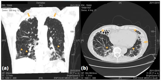 While viral lung damage seems certain, there are many environmental factors that might contribute to the development of pulmonary diseases, and that are likely to be expressed in older patients. Exposure to environmental factors is a less controlled factor in studies although the impact on lung health has been well recognized and the household air pollution has been estimated as the leading environmental cause of death worldwide [31,32,33] Biomass fuel and domestic smoking such as wood-burning stoves, a common practice in the Peruvian Andean region, are a known risk factor for several pulmonary diseases including non-TB bronchiectasis, chronic bronchitis, cor pulmonale, and convey 2.5-times greater risk to develop chronic obstructive pulmonary disease [34,35,36]. Four out of the nine patients who presented bronchiectasis on chest-CT scan reported daily use of wood-burning stoves as the main source of cooking. On the other hand, work-related exposure such as pneumoconiosis and drug-related damage may lead to interstitial lung diseases [37]. We found that among those with GGO suggesting fibrotic changes on chest-CT scan, one was an active smoker, four has been daily exposed to secondhand smoke but none had been exposed to mines, paint, lead, or industrial smoke. Furthermore, none of the three patients who reported long-term use of drugs related to lung damage (losartan and sertraline) presented GGO findings on imaging.