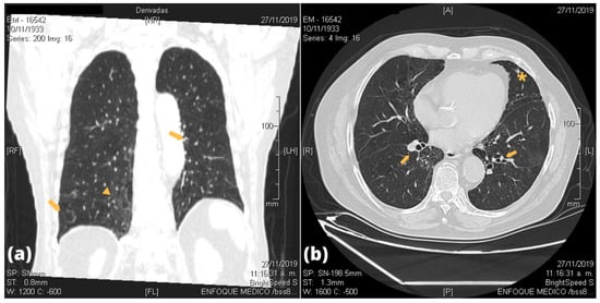 Imaging studies by CT scans of the lungs were done in all patients, of which twelve showed abnormal findings. Figure 1 and Figure 2 show some of the most frequent lesions found in the participants’ CT scans. Most of them were localized in the lower lobe of either lung. Bronchiectasis were present in nine patients, and five were bilateral. Ground-glass opacities (GGO) were found in seven patients, whereas bilateral pleural thickness in five patients. All lung lesions are shown in Table 3 and a detailed descriptions of radiological lung findings on chest CT scans are shown in Appendix B. Pulmonary function by spirometry was successfully assessed in 12 patients as two were unable to tolerate the test. Only two had abnormal pattern findings: one had a restrictive pattern, and the other an obstructive pattern. PVL was measured in all patients; the median PVL value was 1925 copies/mL (IQR = 981–2868 copies/mL).