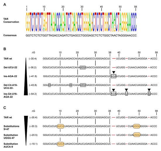 Sequences of the TAR region of natural HIV-1 subtype B virus isolates were downloaded from the Los Alamos HIV sequence database (last modified November 2020). The 1662 retrieved sequences were aligned and visualized using Weblogo (https://weblogo.berkeley.edu, accessed on 9 July 2021) to assess sequence conservation in silico. Sequences were used to obtain a consensus sequence based on sequence prevalence (Figure 1A).