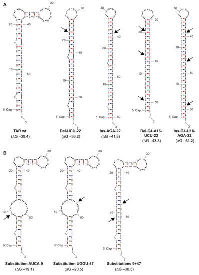 - Berkhout, B. Structural features in TAR RNA of human and simian immunodeficiency viruses: A phylogenetic analysis. Nucleic Acids Res. 1992, 20, 27–31. [Google Scholar] [CrossRef] [Green Version]
