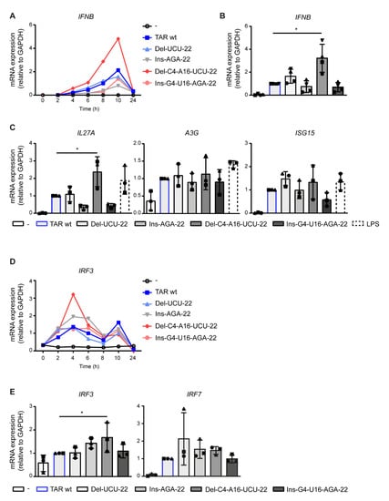 To investigate the effect of TAR RNA stabilization on the induction of antiviral responses, human monocyte-derived dendritic cells (DCs) were treated with TAR wt or mutants with higher stability, and IFNB transcription was assessed every 2 h (h) after stimulation. Similar to what was previously reported, TAR wt induced strong IFNB transcription, which peaked around 10 h after stimulation [] (Figure 3A). TAR mutant Del-C4-A16-UCU-22 induced IFNB transcription at higher levels than observed for TAR wt, starting at 4 h after stimulation and persisting at peak level (Figure 3A). In contrast, IFNB transcription induced by TAR mutant Del-UCU-22 was slightly enhanced compared to TAR wt-induced IFNB transcription up to 8 h after stimulation, whereas Ins-AGA-22 and Ins-G4-U16-AGA-22 showed a trend towards decreased IFNB transcription compared to TAR wt (Figure 3A,B). Next, we assessed the transcription of interferon-stimulated genes (ISGs) and found that the different TAR mutants induced a similar transcription pattern for IL27A as compared to IFNB transcription (Figure 3C). TAR mutant Del-C4-A16-UCU-22 significantly increased IL27A transcription compared to TAR wt and exceeded the response induced by the positive control LPS (Figure 3C). In contrast, mutant Del-UCU-22 induced similar levels, while mutants Ins-AGA-22 and Ins-G4-U16-AGA-22 induced lower levels of IL27A transcription compared to the TAR wt (Figure 3C). Furthermore, all TAR mutants induced APOBEC3G (A3G) and ISG15 transcription; however, these responses were similar to the TAR wt-induced responses and were not further enhanced (Figure 3C).