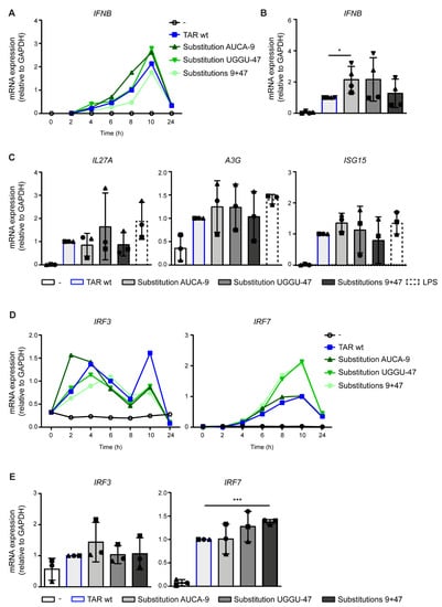 Next, we tested the effect of TAR mutant Substitution AUCA-9 and mutant Substitution UGGU-47, with disrupted base pairing in the lower TAR stem on the induction of antiviral responses (Figure 1C and Figure 2B). Interestingly, the TAR mutant Substitution AUCA-9 significantly enhanced IFNB transcription compared to TAR wt-induced responses (Figure 4A,B). Furthermore, a trend towards enhanced A3G, ISG15 and IRF3 transcription was observed with the Substitution AUCA-9 mutant while leaving IL27A and IRF7 transcription unaffected (Figure 4C,E). The Substitution UGGU-47 mutant enhanced IFNB, A3G, IL27A and IRF7 transcription, although significance was not achieved due to donor variation (Figure 4B,C,E). ISG15 and IRF3 transcription levels were not affected by the Substitution UGGU-47 mutant (Figure 4C,E). The TAR double mutant Substitutions 9 + 47 with restored TAR hairpin integrity (Figure 1C and Figure 2B) induced IFNB, ISG and IRF3 transcription similar to the TAR wt (Figure 4A–C,E), strongly suggesting that the increased IFN response observed for mutant Substitution AUCA-9 and Substitution UGGU-47 is due to loss of structural stability. The single mutants Substitutions AUCA-9 and Substitution UGGU-47 did not affect IRF7 transcription or resulted in a trend towards increased IRF7, respectively (Figure 4D,E). Strikingly, the Substitution 9 + 47 mutant significantly enhanced IRF7 transcription compared to the TAR wt (Figure 4D,E), suggesting that both TAR stability and the TAR sequence affect antiviral sensing, leading to different immune responses. Our data indicate that lower stability of the TAR structure due to decreased hairpin integrity enhances antiviral immunity, suggesting that the lower TAR stem might be involved in the detection by viral-sensing mechanisms.