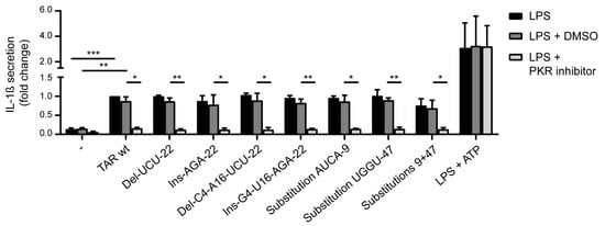 PKR-dependent sensing of abortive HIV-1 RNA (TAR wt) induces NLRP3 inflammasome activation and the secretion of IL-1β in the supernatant of LPS-primed DCs []. For the binding of TAR to PKR, the integrity of the TAR hairpin is required []. To examine whether hairpin stability and sequence variation in TAR influences PKR-mediated sensing, DCs were treated with LPS or LPS in combination with the different TAR mutants, after which IL-1β secretion in the supernatant was assessed. Treatment of DCs with LPS induced IL-1β background levels, while costimulation of DCs with LPS and TAR wt induced the processing of pro-IL-1β into bioactive IL-1β secreted by the cell (Figure 5). LPS in combination with ATP was used as a positive control for the processing of pro-IL-1β. Strikingly, all different TAR mutants, including the mutants with disrupted hairpin integrity, induced strong IL-1β responses in LPS-treated cells similar to TAR wt-induced responses (Figure 5). Similar to TAR wt, the IL-1β responses induced by the different structures were abrogated in the presence of a PKR inhibitor and unaffected by the DMSO control (Figure 5). Our findings indicate that stabilization of TAR or destabilization of the lower TAR stem does not impede viral sensing by PKR, suggesting that the complete intact TAR stem might not be needed for PKR activity resulting in IL-1β secretion. Furthermore, our data imply that the introduced TAR RNA sequence variation does not affect PKR-dependent sensing.