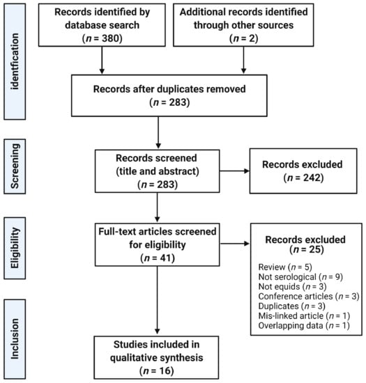 In this scoping review, 16 studies were identified in which authors described the seroprevalence of WNV among African equids. Two recently published studies [,], were outside our search period. An article referenced in one of these articles was not found in our search [].