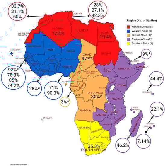 Map of Africa showing seroprevalence reported in different countries (* indicates study where samples were screened from multiple countries []). Created with MapChart.net (accessed on 26 May 2021).