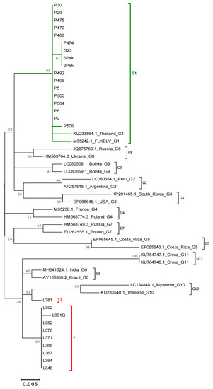 Since phylogenetic analysis based on 903 bp fragments provided the data on the existence of at least two subgenotypes within genotype G6, we attempted to classify possible subgenotypes in the G6 genotype by taking into account all the sequences known to date to be affiliated with this genotype. However, we found some inconsistency in classification of several sequences to a particular subgenotype of G6 in recently published data [30,42,43]. Most of sequences available from GeneBank and affiliated so far with genotype G6, had lengths shorter than 903 bp; therefore, this analysis included sequences of 501 bp length, which were previously used in other studies [43,44]. In addition, 40 available sequences 400 bp long, which contained molecular markers allowing their affiliation to particular subgenotype of the G6 genotype, were also considered in this analysis (Table S3). Additionally, chronological dates of the publishing of particular sequences were considered in the nomenclature of each subgenotype (Table S3). A newly proposed classification of subgenotype within genotype G6 is shown in Figure 3 and Table S3. This includes the existence of 13 subgenotypes, named from G6a to G6m. Eight sequences isolated from cattle from Pakistan belonged to subgenotype G6l, while one sequence, L381, was designed putative subgenotype G6m (Figure 3).