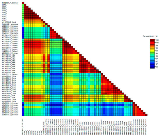 SDT color-coded matrix of pairwise identity scores generated by the alignment of a G6 501 bp long BLV env gene set of nucleotide sequences for nine Pakistan BLV isolates and 49 G1 representatives from other parts of the world.