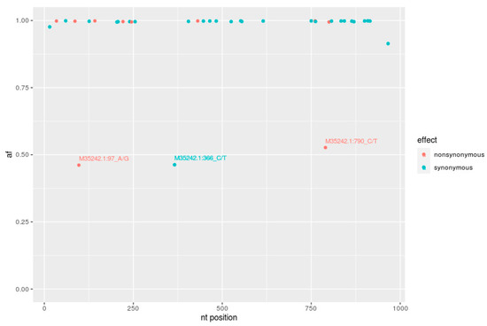 Frequency distribution of single nucleotide variants (SNVs) across the gp51 encoding 903 bp fragment of env gene sequences of an L391 sample. Synonymous (•) and nonsynonymous (•) SNVs identified after mapping trimmed reads to the reference BLV sequences (M35242.1_FLKBLV). Unique SNVs are described in detail (af—allele frequency, nt position—nucleotide position).