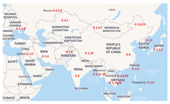 Distribution of BLV genotypes in Asia compiled from published literature. Map of Asia adapted from https://24timezones.com/worldmap#gref (accessed on 23 June 2021).