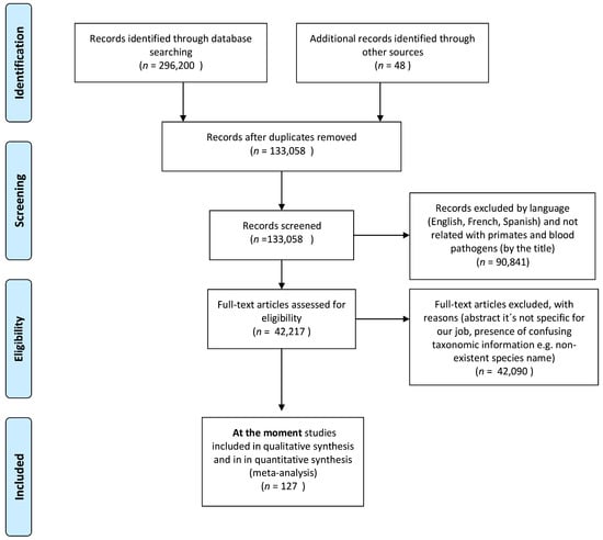 Chicago/Turabian StyleCarrillo-Bilbao, Gabriel, Sarah Martin-Solano, and Claude Saegerman. 2021. "Zoonotic Blood-Borne Pathogens in Non-Human Primates in the Neotropical Region: A Systematic Review" Pathogens 10, no. 8: 1009. https://doi.org/10.3390/pathogens10081009