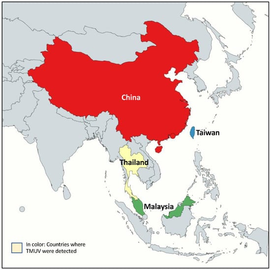 Geographic distribution of TMUV in Asia. Map representing countries where TMUV has been reported. Created with mapchart.net.