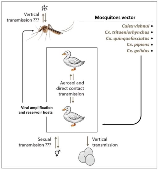TMUV transmission occurs during mosquito biting on a vertebrate host (Figure 4). However, although the bite of an infected mosquito is probably the main mode of transmission, the existence of other modes may exist. Vertical transmission within mosquitoes was examined for Cx. tritaeniorhynchus and Cx. Quinquefasciatus, but the progeny was not infected []. Nevertheless, further studies are needed to clearly assess the vertical maintenance of infection in mosquitoes.