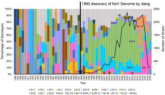 Zhou, H.-L.; Chen, L.-N.; Wang, S.-M.; Tan, M.; Qiu, C.; Qiu, T.-Y.; Wang, X.-Y. Prevalence and Evolution of Noroviruses between 1966 and 2019, Implications for Vaccine Design. Pathogens 2021, 10, 1012. https://doi.org/10.3390/pathogens10081012