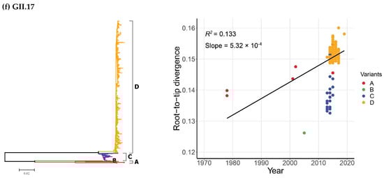 - Rambaut, A.; Lam, T.T.; Max Carvalho, L.; Pybus, O.G. Exploring the temporal structure of heterochronous sequences using TempEst (formerly Path-O-Gen). Virus Evol. 2016, 2, vew007. [Google Scholar] [CrossRef]