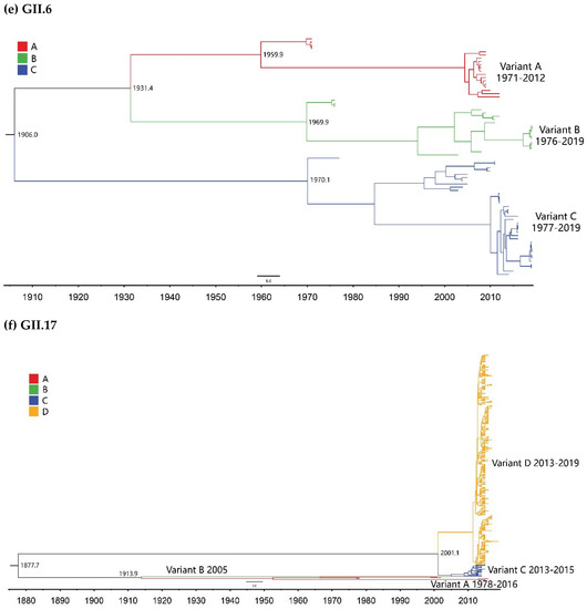 - Tohma, K.; Lepore, C.J.; Ford-Siltz, L.A.; Parra, G.I. Evolutionary dynamics of non-GII genotype 4 (GII.4) noroviruses reveal limited and independent diversification of variants. J. Gen. Virol. 2018, 99, 1027–1035. [Google Scholar] [CrossRef] [PubMed]