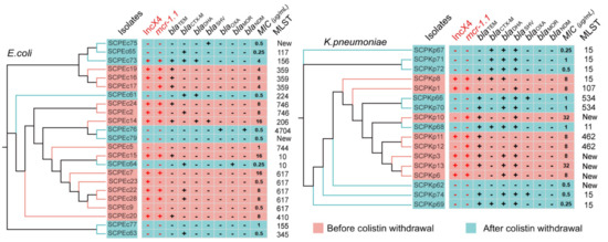 Single nucleotide polymorphism (SNP) phylogenetic analysis of E. coli (Ec) and K. pneumoniae (Kp) and the presence of mcr-1.1, IncX4-type plasmid, beta-lactams resistance genes, minimum inhibitory concentration (MIC) of colistin (μg/mL) and ST during policy change. New stands for new ST (Tables S2 and S3). The two columns of mcr-1.1 and IncX4-type plasmid were highlighted in red, indicating that they were related. blaTEM included variants encoding TEM-116,-181,-1A,-1B,-1C; blaCTX-M included variants encoding CTX-M-3,-14,-55,-65; blaDHA included variants encoding DHA-1,-4; blaSHV variants were not differentiated; blaOXA encodes OXA-1; blaMOR encodes MOR-2; and blaNDM encodes NDM-1 (Table S4).