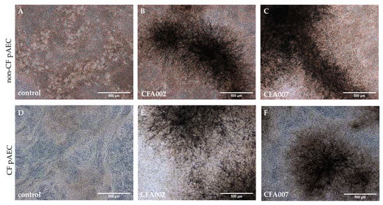 Aspergillus fumigatus achieved hyphal growth on non-CF and CF epithelium. After 24 h incubation, the apical surface of non-CF (A–C) and CF (D–F) differentiated cultures were live imaged by brightfield microscopy to record localisation across the apical surface. Representative images are shown of uninfected control inserts (A,D) and CF A. fumigatus clinical isolates CFA002 (B,E) and CFA007 (C,F).