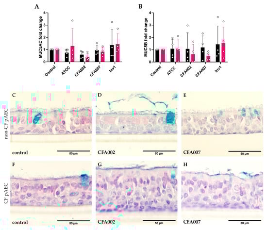 Aspergillus isolates at MOI 0.01 did not induce mucin gene or protein expression. Following 24 h culture with A. fumigatus isolates, epithelial RNA was analysed for MUC5AC (A) and MUC5B (B) gene expression by qPCR. Representative images of Alcian Blue stained sections (C–H) demonstrating no significant changes in mucin protein between uninfected control epithelium (C,F) and epithelium challenged by Aspergillus CFA002 (D,G) and CFA007 sections (E,H). Non-CF sections on the top row (C–E) and CF sections on the bottom (F–H). Note: Non-CF results are indicated with black bars and CF with red bars. Data points indicate results from individual pAEC cultures.