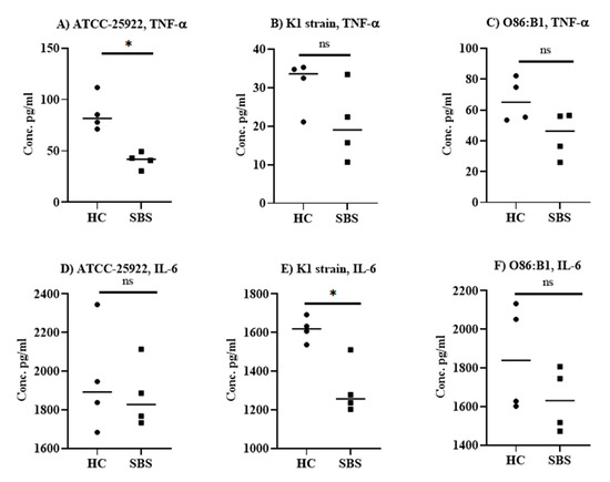 Next, we tested the effect of plasma from SBS and HC subjects on the inflammation induced by E. coli co-incubated with mouse splenocytes in vitro. We showed that both SBS and HC plasma samples significantly (p < 0.05) inhibited TNF-α production induced by the respective E. coli strains (Figure S2A–C), although a more profound inhibition of TNF-α production was observed with the plasma samples from subjects with SBS (Figure 2A–C). SBS plasma was 2–3-fold more effective at suppressing TNF-α in the culture supernatant compared to plasma from HC. Furthermore, the TNF-α inhibition was similar across all the tested E. coli strains, with the highest inhibition observed with the SBS2 plasma sample (Figure S2B,C). For IL-6, HC plasma samples had no significant effect on IL-6 production induced by E. coli strains (Figure S2D–F), except for controls 3 and 4, which elicited a significant inhibition of IL-6 production against E. coli O86:B1 strain (Figure S2F). Irrespective of the E. coli strain, all the plasma samples from SBS subjects significantly (p < 0.05) inhibited the production of IL-6 when compared to splenocytes stimulated by E. coli alone (Figure S2D–F). Compared to HC samples, SBS plasma samples significantly inhibited IL-6 production only against the K1 strain (Figure 2E), while no significant difference was found for other E. coli strains (Figure 2D,F). Overall, our data suggest that plasma from the SBS subjects is more effective at neutralizing E. coli-induced pro-inflammatory cytokine responses in vitro.