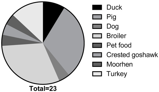 The S. enterica serovar Schwarzengrund strains analyzed in this study were collected between 2000 and 2018 (n = 23). These isolates were obtained from multiple sources, including duck (n = 2), pig (n = 7), dog (n = 1), broiler (n = 7), pet food (n = 1), crested goshawk (n = 1), moorhen (n = 1), and turkey (n = 3) (Figure 1). Recovered isolates were then subjected to serological tests, as previously described, for identification [48]. Prior to use, all strains were incubated overnight (14–16 h) on trypticase soy agar or in trypticase soy broth plated at 37 °C.