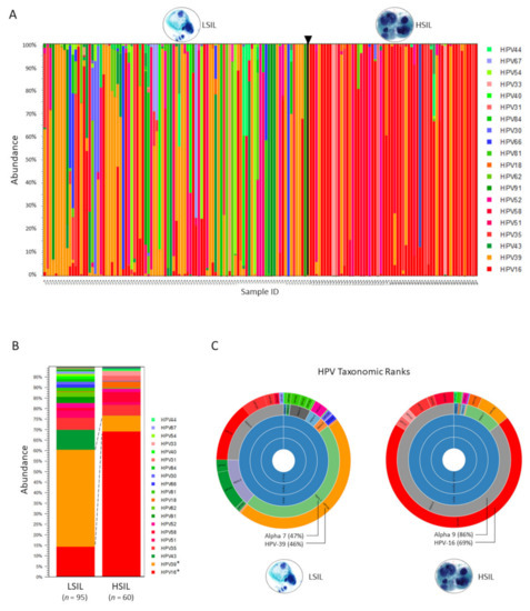 Taxonomic profiling results based on the HPV Reference Index. (A) Abundance of HPV genotypes found in individual LSIL and HSIL samples are shown as stacked bars. HPV type-specific carcinogenicity (carcinogenic, possibly carcinogenic, and not carcinogenic) are colorized in shades of red, blue, and green, respectively (legend). Deep sequencing of HPV E6/E7 amplicons derived from each LSIL (n = 95) or HSIL (n = 60) sample identified 32 unique HPV genotypes with the top 20 shown (legend) and quantitated their composition (%) based on abundance (n) of mapped reads to total mapped reads. (B) HPV genotype composition of samples grouped by cytological grade i.e., LSIL and HSIL. Visualization and comparison of grouped samples (stacked bars) revealed the dominant genotypes in LSIL and HSIL as HPV-39 (46%) and HPV-16 (69%), respectively with significant changes in proportional composition (Baggerley’s test, * p-value (Bonferroni) < 0.001). (C) Sunburst plots visualize hierarchical data outwardly from parent to child nodes. Here, sunburst plots reveal distinct differences in the HPV communities according to seven taxonomic ranks, specifically, the last two ranks (genus/species and genotypes) between LSIL and HSIL.