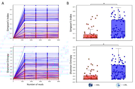 Diversity analysis of HPV genotypes in LSIL and HSIL samples. (A) Alpha diversity rarefaction curves estimate the indices for HPV genotypes in LSIL (n = 95) and HSIL (n = 60) samples. (B) Summary statistics are shown as boxplots after categorical grouping. A total of 29 unique genotypes were found in LSIL versus 22 genotypes for HSIL. Species richness measured by Simpson’s index showed a reduction from LSIL (median = 0.146) to HSIL (median = 0.062) samples (Mann-Whitney test, * p < 0.001). The respective Shannon indices for LSIL (median = 0.454) and HSIL (median = 0.215) were indicative of reduced diversity with disease progression (Mann-Whitney test, * p < 0.001).
